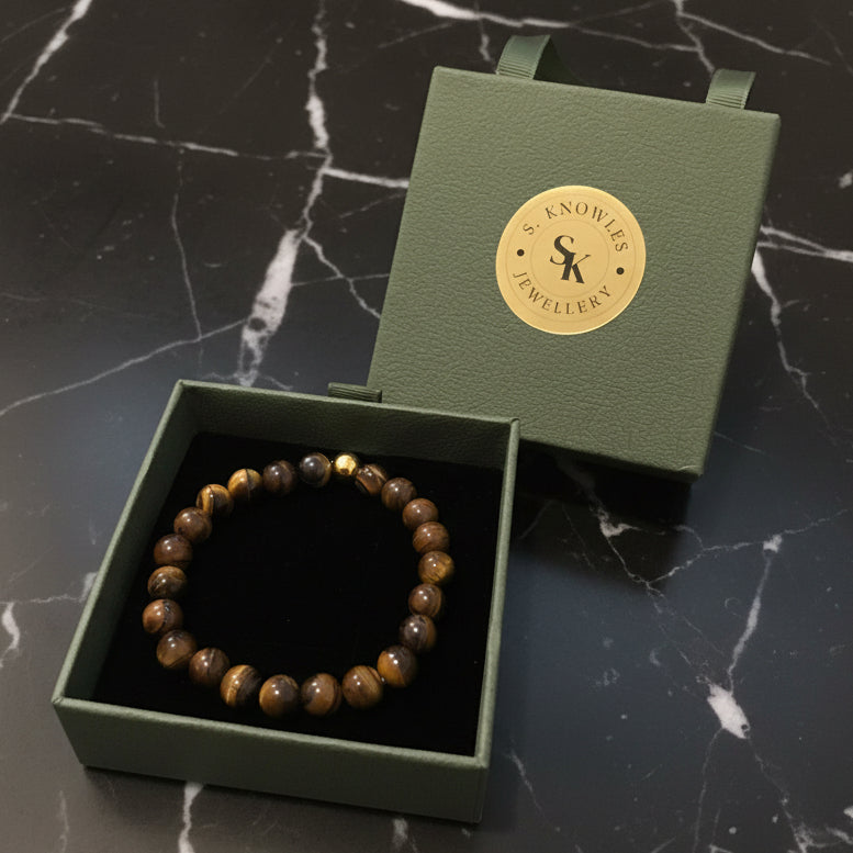 This refined men's stretch bracelet combines the natural warmth of 8mm tiger's eye beads with a striking 18k gold focal bead, creating an understated yet commanding presence. The tiger's eye stone brings earthy sophistication and a distinctive golden-brown luster, while the precious metal accent elevates the design with timeless elegance. Perfect for the modern man who appreciates quality craftsmanship and subtle luxury, this piece transitions effortlessly from casual to formal occasions. The stretch construction ensures comfortable everyday wear without compromising on style.