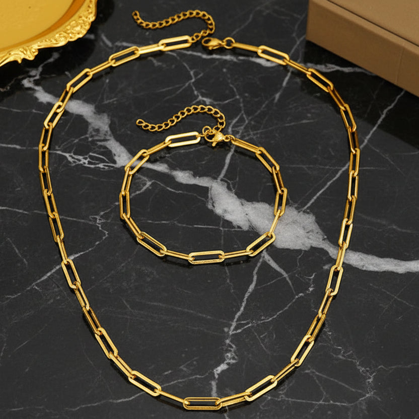 Elevate your everyday elegance with this refined 4.5MM Paperclip Chain Set, crafted in lustrous 18k gold plating with advanced PVD coating for lasting brilliance. Designed for the modern woman who values both style and substance, this versatile set resists tarnishing and withstands daily wear with effortless grace. The distinctive paperclip link design offers contemporary sophistication, while its waterproof construction ensures durability through life's moments. Perfect for layering or wearing solo, this timeless piece transitions seamlessly from day to evening, making it an essential addition to any refined jewelry collection.