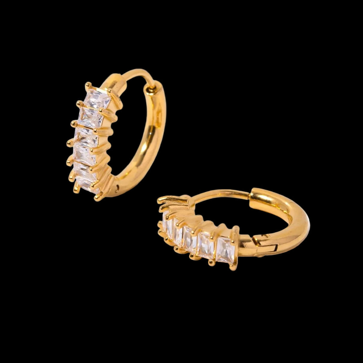 Elevate your everyday elegance with these refined CZ Baguette Huggies. Crafted from premium 316L stainless steel and finished with luxurious 18K gold plating, these huggies offer timeless sophistication with lasting durability. The sparkling cubic zirconia baguettes catch light beautifully, creating a polished look that transitions seamlessly from day to evening. Perfect for those who appreciate quality craftsmanship and understated luxury.